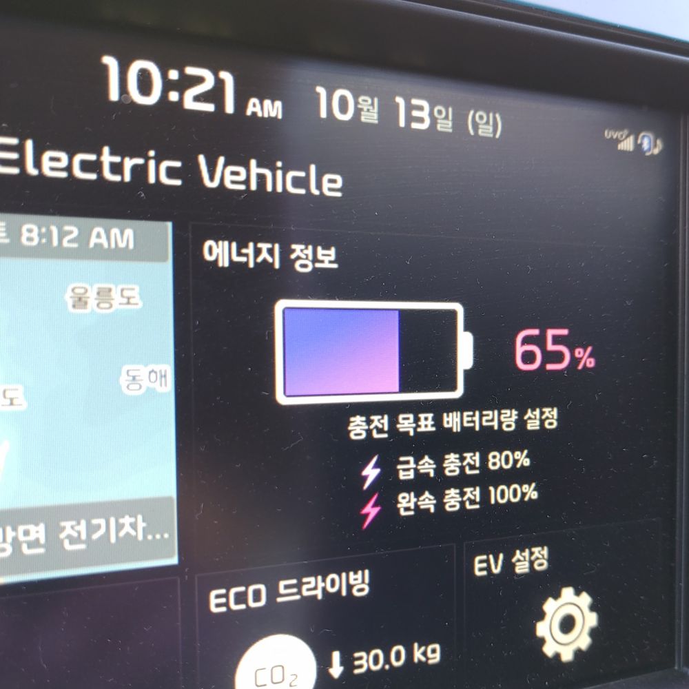 여기까지 175km주행 남은 배터리량은 65%. 배터리가 30% 줄어들고 175km 이동했으니 1%에 5.8km 이동한 걸로 보입니다.