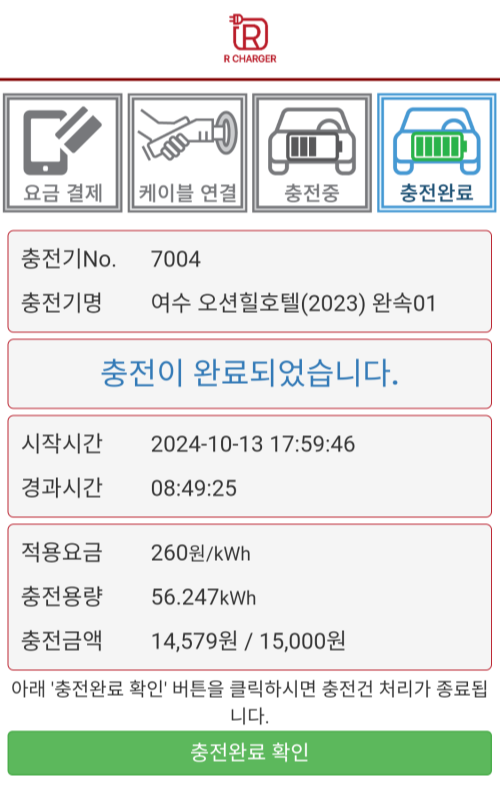 여수오션힐호텔에는 7kw 1개, 11kw 2개의 완속충전기가 총 3개가 있었고 충전가격은 260원이었습니다. 밤에 충전시켜 두고 잤습니다. 레드이엔지라는 회사였는데 울산에서는 본 적이 없는 회사라서 어플을 받아서 진행했습니다. 나중에 확인해 보니 다행히 제가 가진 신용카드로 할인되는 충전회사였습니다.