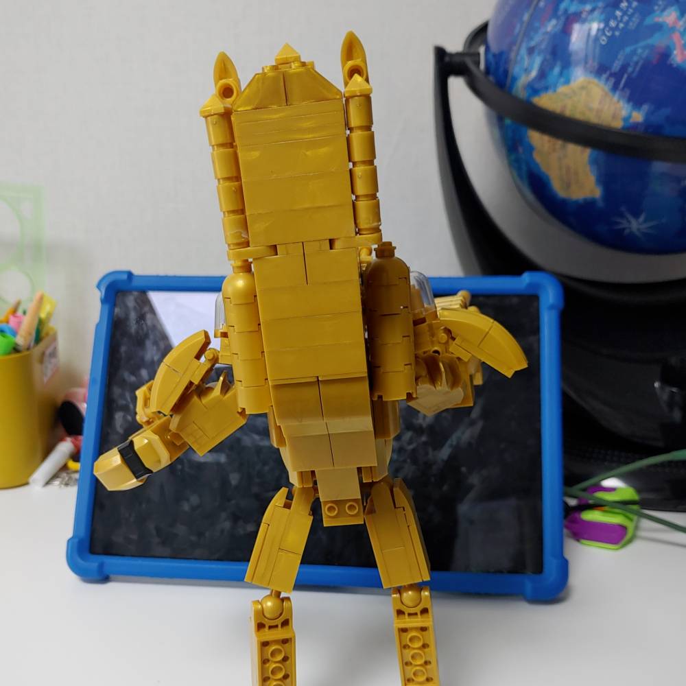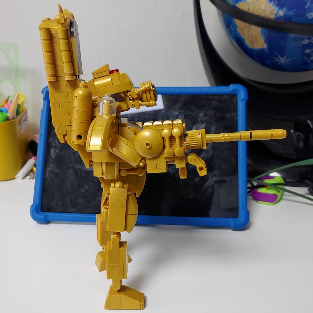 완성되니 아이가 가지고 놀려고 했는데 캐논포 부분이나 메고있는 시계, 손목 부분 등 몇몇 곳이 자꾸 떨어져서 순간접착제를 이용해서 안 떨어지게 붙여버렸습니다. 아이가 가지고 놀다가 블록들이 사라지면 나중에 다시 못 찾을 수도 있어서 이 방법이 가장 낫다고 생각했습니다.
