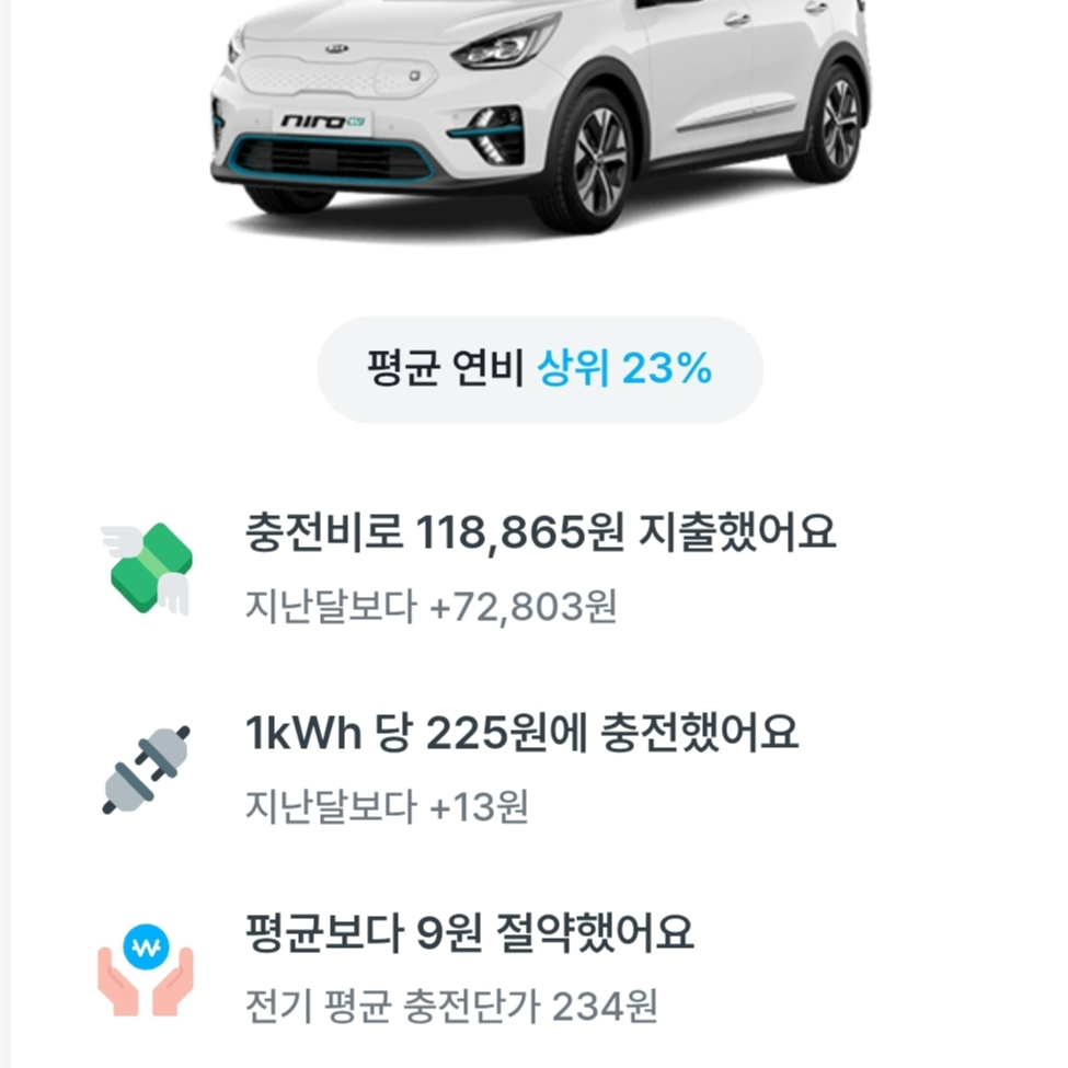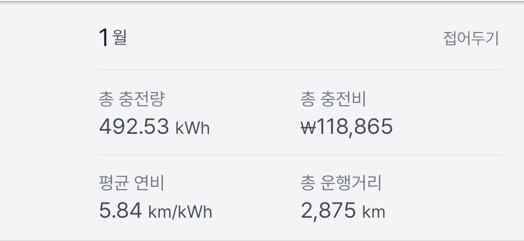 | 총 충전량(kWh) | 총 충전비(won) | 총 운행거리(km) | 평균연비(km/kWh) | 1km당 충전비(won) | |