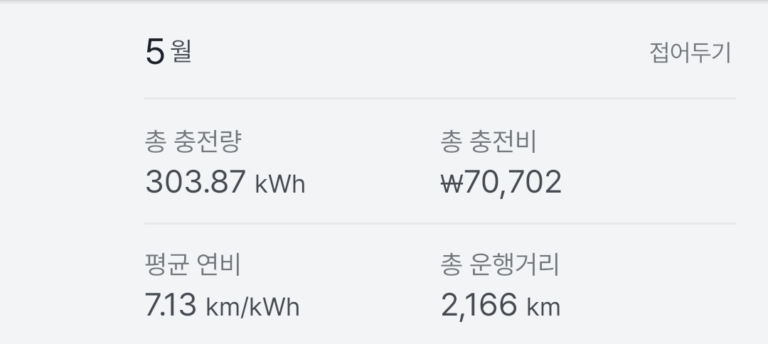 5월부터는 에어컨을 켜고 다니는 날들이 점점 많았는데 그런 것 치고는 전비가 나쁘지 않습니다. 7.13km 으로 계기판에 표시되는 것에 비하면 형편없이 낮은 수준입니다. 실제 충전량으로 계산한 전비라서 오히려 계기판보다 정확한 수치라고 보시면 되겠습니다.