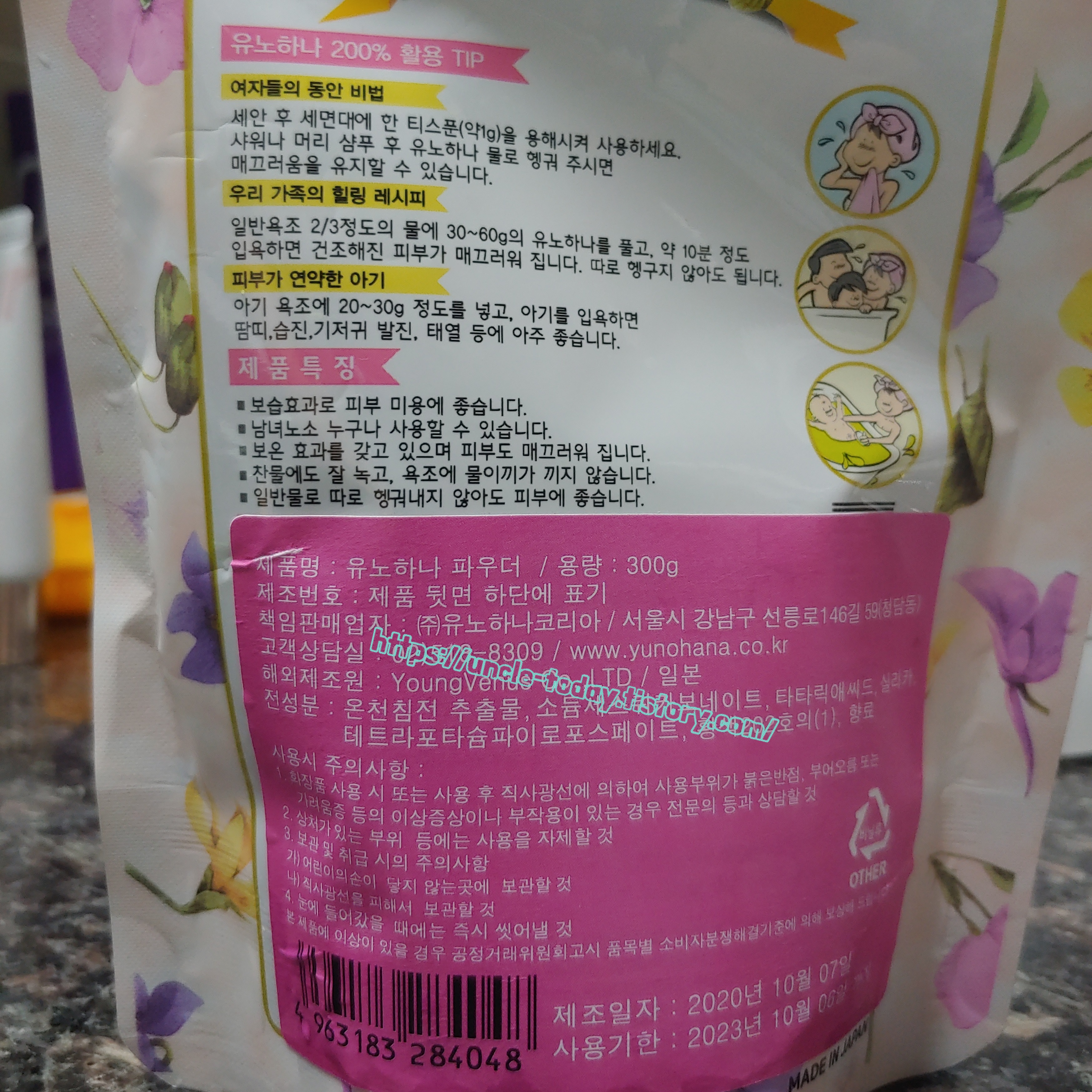 일반욕조 2/3정도의 물에 30~60g의 유노하나를 풀고, 약 10분정도 입욕하라고 쓰여 있습니다. 따로 헹구지 않아도 된다고 합니다. 위의 파우치가 300g이라서 30g씩 넣으면 10번까지 사용할 수 있습니다. 일주일에 2번, 30g씩 넣는다고 해도 약3~4천원정도가 없어지는 거라서 결코 저렴하다고 할 수는 없죠.
