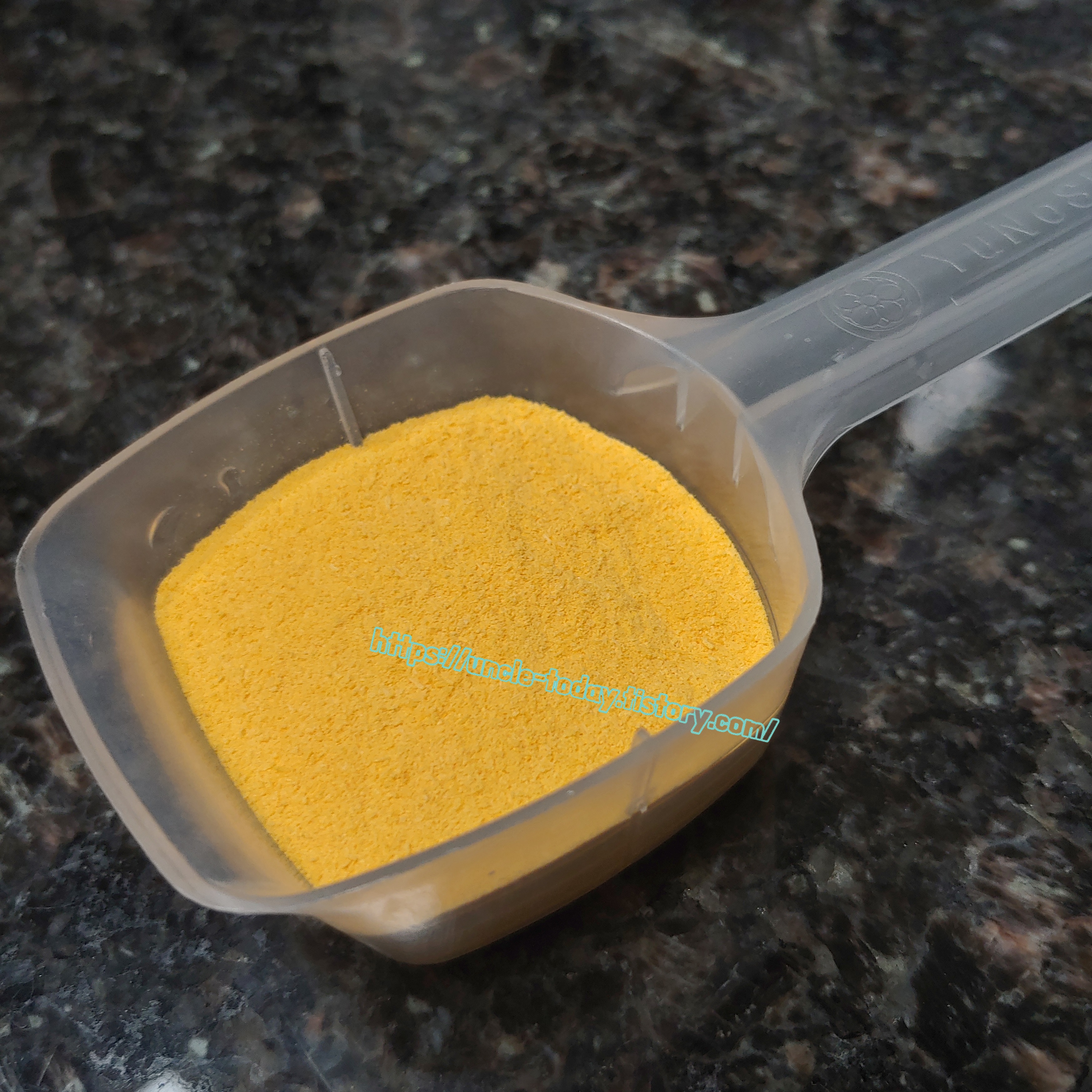 30g이면 이정도 입니다. 색은 연한 주황색입니다. 30g만 넣어서 사용하는 데 그 이유는 욕조에 물을 많이 넣지 않기 때문이에요. 아이가 노는데 필요한 정도의 물만 채워 넣고 써서 이 정도만 해도 충분하다고 생각하거든요. 만약에 이렇게 사용했는데 건조했다면 더 넣었을 건데 피부가 매끈해져서 그냥 이대로 계속 쓰고 있습니다.