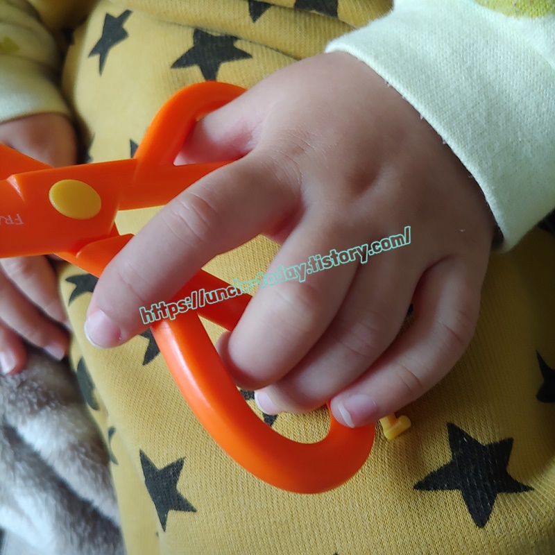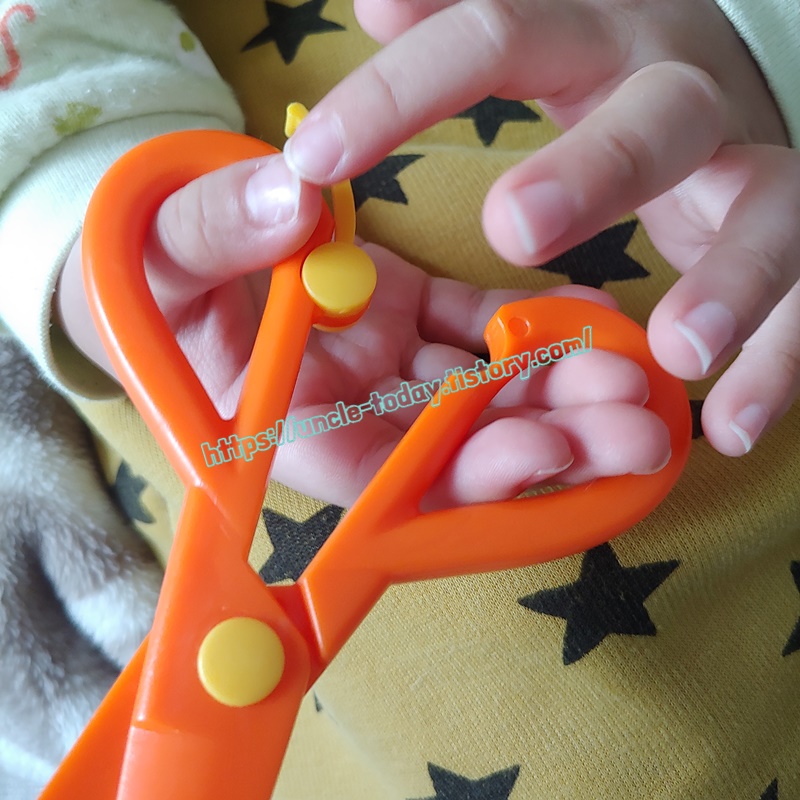 아기가 점점 능력치가 올라감에 따라서 새로운 장비에 대한 욕심인지 그전에 있던 가위를 던져서 부서 버렸습니다. 원래 레벨이 올라가면 장비는 바꿔주는 게 맞긴 하지만 3살이나 4살이나 차이도 없는데 ㅠㅠ 그전에 있던 가위는 다이소에서 구매한 저렴한 가위였는데 플라스틱 앞에 철이 살짝 덫 대여 있어서 손을 보호해주는 가위이긴 했는데 내구성이 좀 약했던 거 같습니다. 그래서 쿠팡에서 또 저렴한 아기용 가위를 구매했습니다.