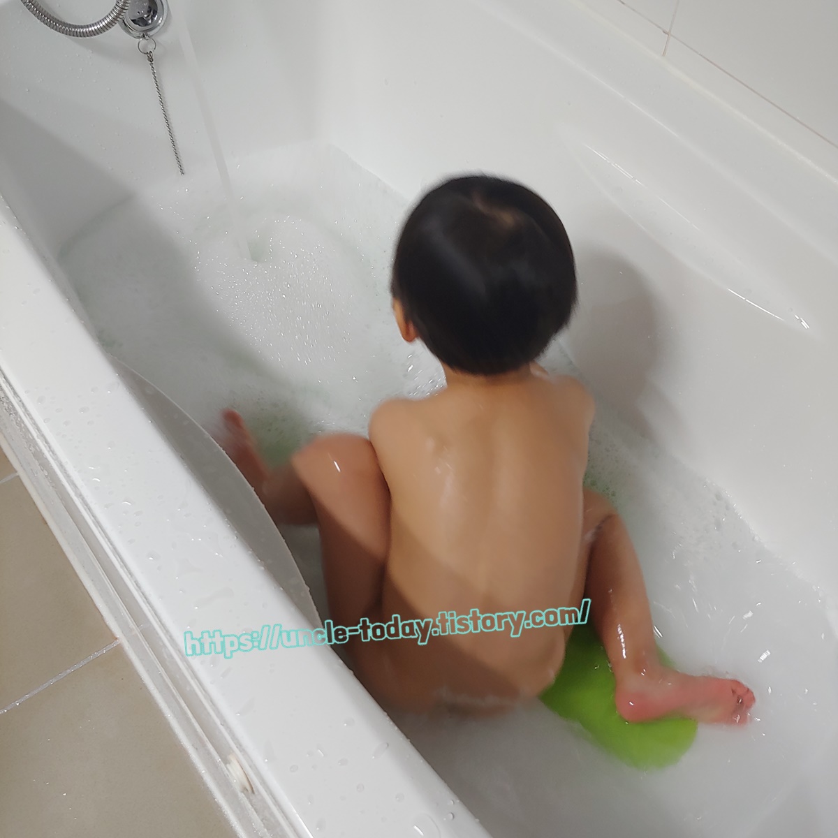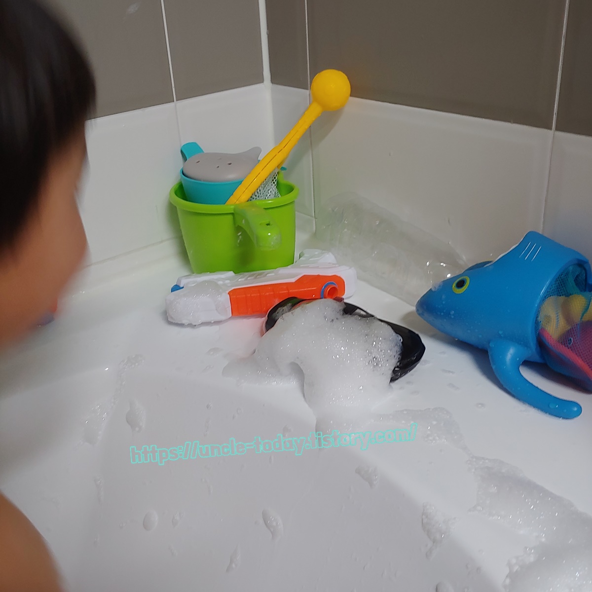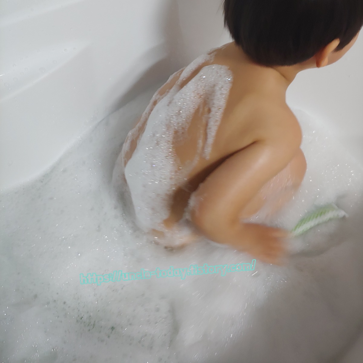 그렇다고 해도 좋아서 가는 게 아니라서 어쩔 때는 샤워하고 나오면 맛있는 거 준다거나 빨리 목욕하고 오면 TV를 보여준다거나 하는 방법으로 샤워를 하고 있어요. 근데 그런 방법을 쓰지 않더라도 아이가 제발로 목욕하려고 하는 경우가 있습니다. 바로 거품목욕이에요.