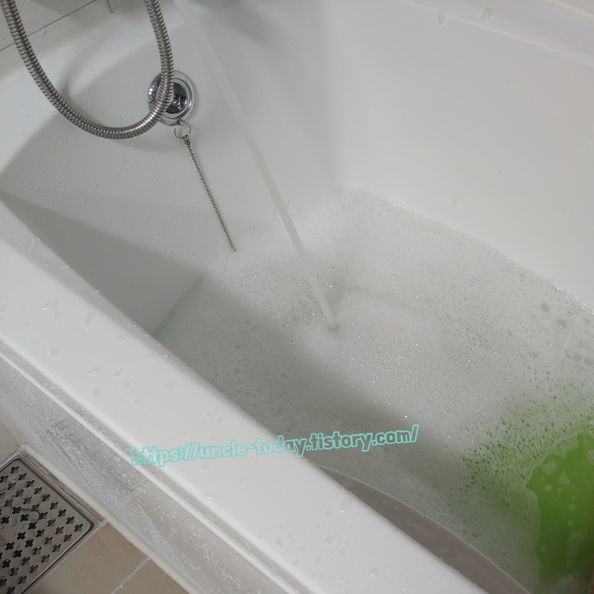 가루를 뿌릴 때는 수도꼭지 아래에 가루를 뿌려놓는 게 거품이 많이 일어나는 데 좋습니다. 수압이 셀수록 수온이 높을수록 거품이 더 많이 난다고 하거든요. 그리고 물을 저어주면 거품이 더 많이 납니다. 주의하실 점은 물을 채우기 전에 가루를 넣으셔야 된다고 해요. 물을 넣고 나서 가루를 넣으면 거품이 나지 않는다고 합니다.