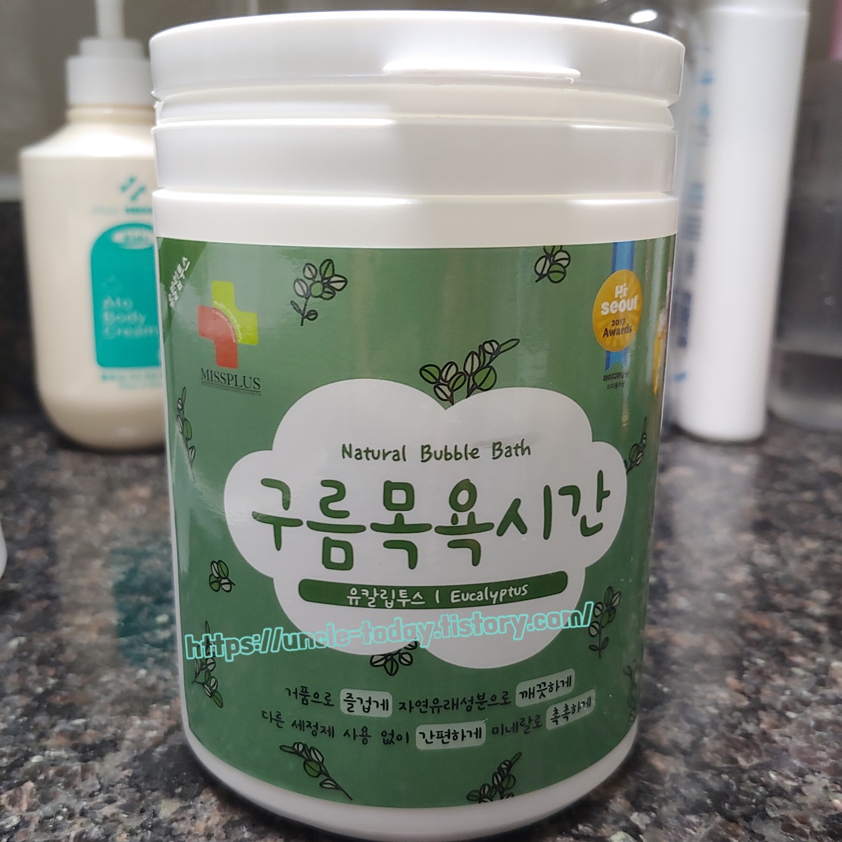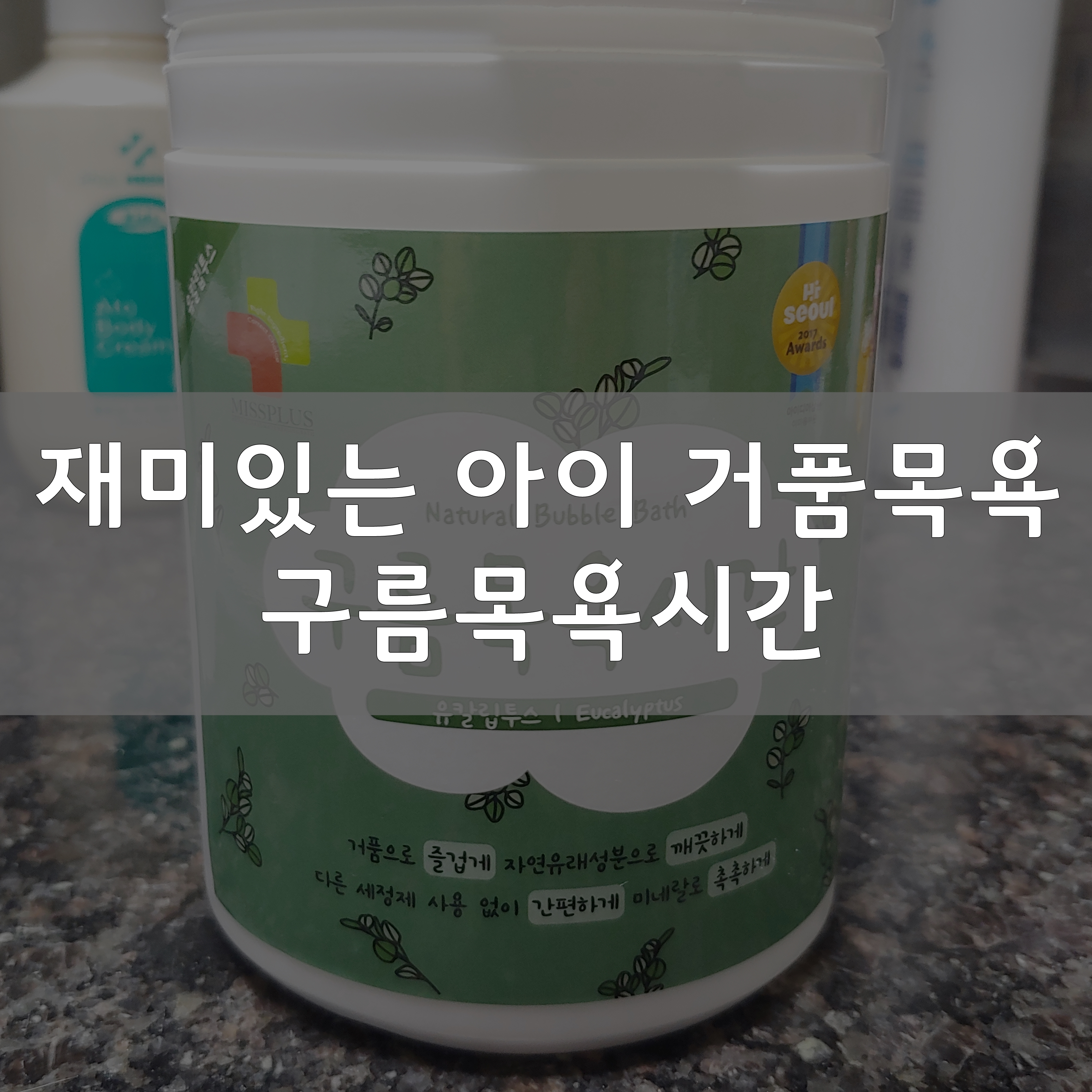 지금은 한 4~5번 정도 해서 그런지 좀 시들해졌는데 처음에는 신기하면 거품목욕을 매일 하자고 했어요. 거품이 등에 저렇게 묻으면 잘 떨어지지 않고 피부에 좋은 영향을 주겠죠? 이 제품은 신안철일염으로 만들어서 갯벌 속의 유기질과 무기질을 포함되어 있다고 합니다. 피부에 미네랄을 제공해 주니 피부가 더 좋아질 거라고 생각됩니다.