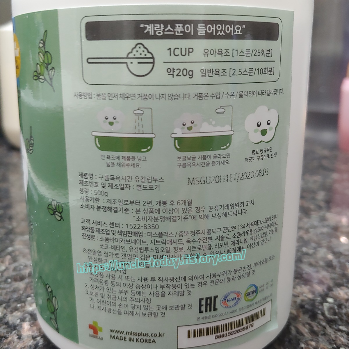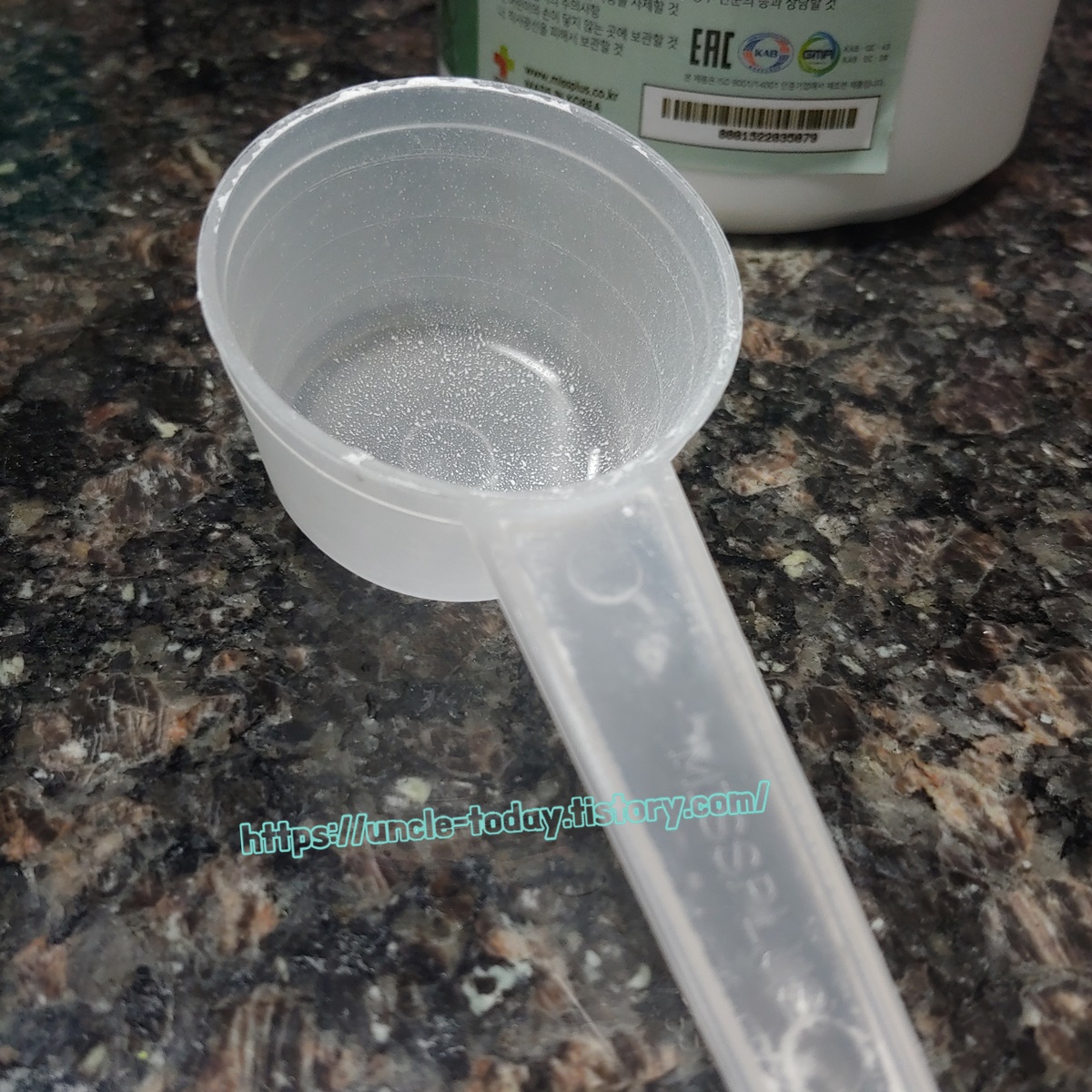 개봉을 하면 안에 계량컵이 들어 있는데 한 컵이 20g이라고 합니다. 처음에는 계량컵이 안 보여서 '계량컵이 안 들어있구나!!'라고 생각했는데 그게 아니라 거품목욕 가루에 파묻혀서 안보였던 거예요. 20g인데 생각보다 계량컵이 좀 크네요.