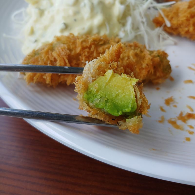 이게 아이먹으라고 주문한 돈까스인데 돈까스 2개와 아보카도튀김 2개로 구성되어 있습니다. 제가 정확하게는 모르지만 메뉴판에는 등심이라고만 되어 있는데 조리방법의 차이인지 돈까스 2개가 약간 식감이 다릅니다. 하나는 보통 돈까스로 흔히 먹을 수 있는 돈까스의 맛이고 다른 하나는 고기가 연해서 입에 넣고 몇 번 안 씹어도 입에서 없어져 버립니다. 튀김류는 그때그때 달라지나 봐요.