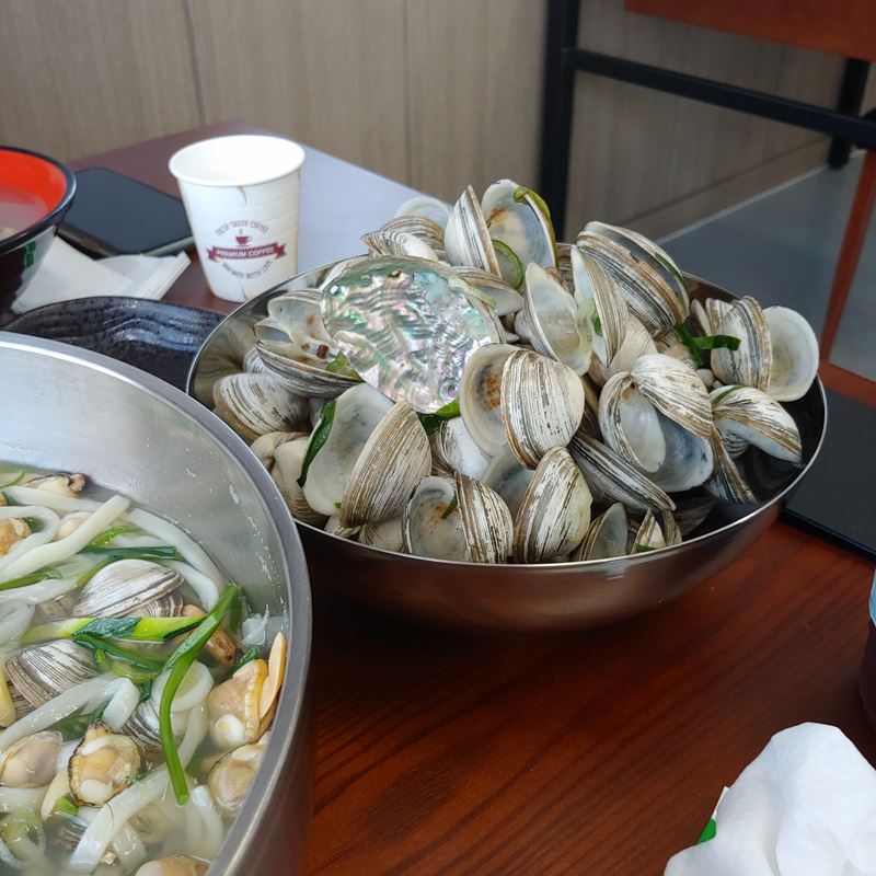 조개칼국수인데 조개가 정말 많이 들어가 있네요. 조개는 동죽, 백합, 모시가 들어간다고 합니다. 살을 대충 빼다가 지쳐서 먹으면서 빼기로 했습니다. 조개 쌓다가 너무 높게 쌓아서 쓰러지는 줄 알았었요. 조개가 정말 너무너무 많이 들어있습니다. 제가 먹어본 해물칼국수 중에서는 살도 통통하고 양도 많고 탑급이네요.