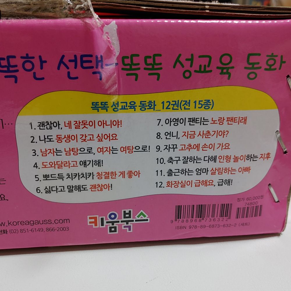 키움북스에서 나온 똑똑 성교육동화입니다. 12권 세트로 구입하니 깔끔하게 박스로 배송이 왔습니다. 주위에 아는 분이 이 책을 구매하려고 계속 보고 있었는데 이번에 저렴하게 나왔다고 하셔서 같이 구입했습니다. 책은 12권이고 안에 브로마이드가 3개가 들어있어서 15종입니다.
