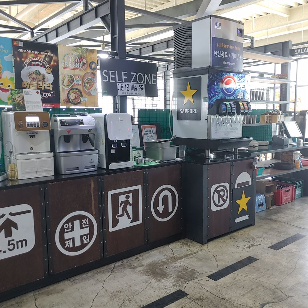 들어가면 셀프코너가 있는데 커피와 정수기, 그리고 각종 음료등이 준비되어 있습니다.