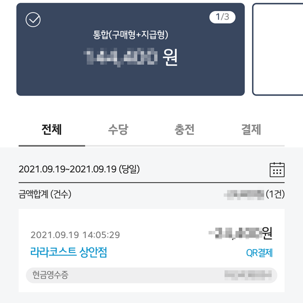 국민지원금으로 계산하고 나왔습니다. 거의 대부분을 식당에서 조금씩 조금씩 쓰고 있습니다.