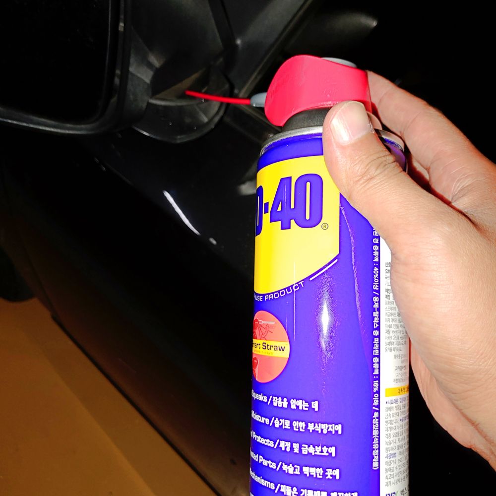 길거리에 주차해놓는 게 항상 불안하지만 어쩔 수 없이 주차하는 경우가 많은데요. 길거리가 아닌 공원 주차장에 대놨는데 이런 일이 발생했네요. 주차해놨을 때 사이드미러를 누군가 억지로 폈던 거 같습니다. 이 그 후로 운전석 쪽 사이드 미러에서 모터 소음이 심하게 나는데 그렇다고 이걸 르노삼성공식정비소에 가서 수리하자니 20만원은 훌쩍 넘어갈 거 같아서 WD-40를 뿌려보기로 했습니다.