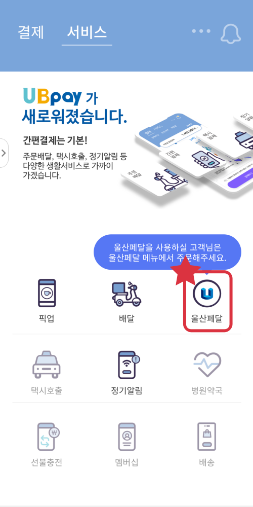 착한페이에 들어가면 울산페달 이벤트 배너가 나와 있습니다. 첫주문시에 5천원 할인이라는 건데 유비페이가 먼지 모르겠는데 울산페달을 이용하기 위해서는 유비페이를 다운받아야 합니다. 유비페이에 들어가서 서비스항목으로 가면 울산페달이 있습니다.