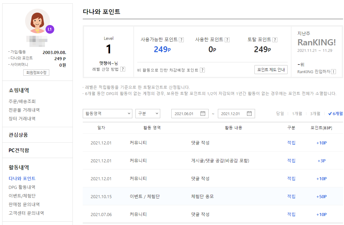 다나와에 가입한 게 2003년 9월이다. 가격비교를 할 때만 사용하던 사이트라서 점수가 거의 없다. 난 포인트를 모으는 걸 좋아하긴 하지만 필요없다고 생각되는 사이트의 포인트까지 모으진 않는다. 포인트를 사용하는 곳이 있는 건지 모르겠다. 레벨을 높이면 뭐가 좋아지는 게 있나?